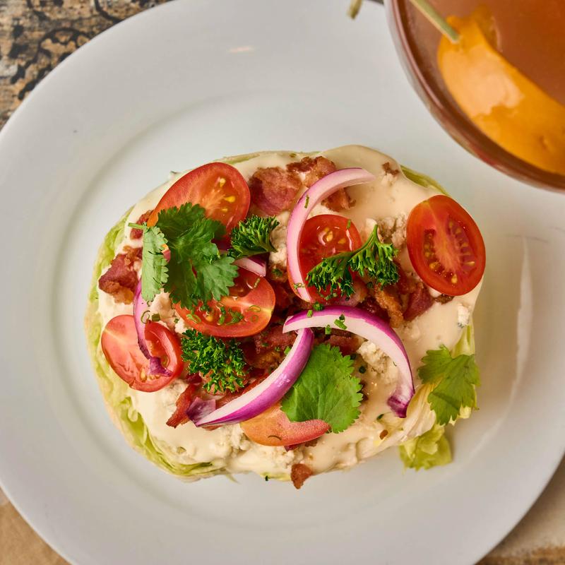 Crisp wedge of iceberg lettuce topped with cilantro cool sauce, served with cherry tomatoes and red onions, finished with bacon bits | Add Grilled Chicken