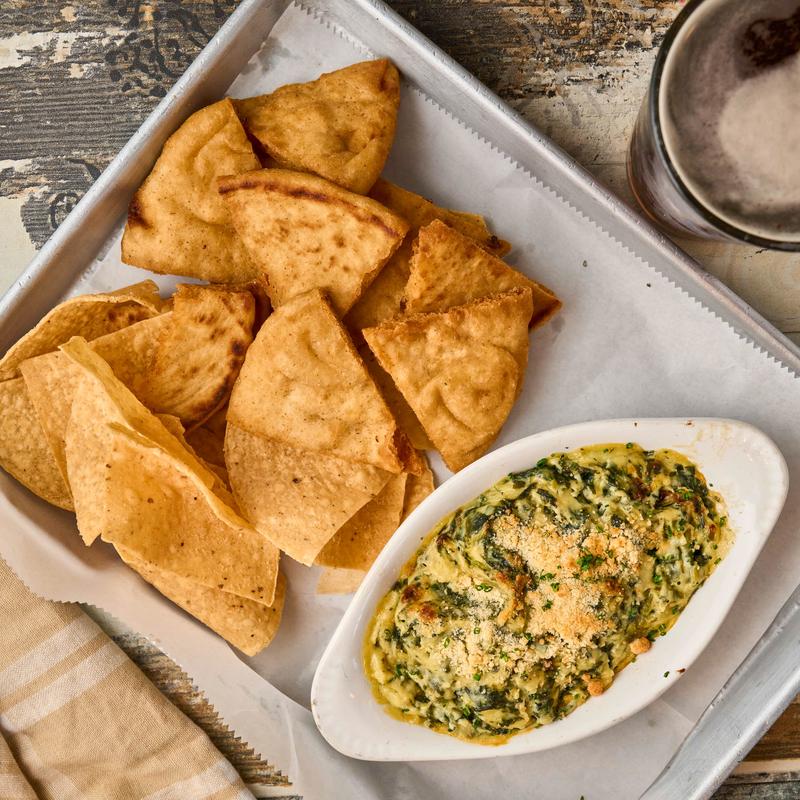 Creamy mixture of fresh spinach and chopped artichoke hearts, blended with velvety cheese, sour cream, and garlic, served with crispy pita bread and chips.