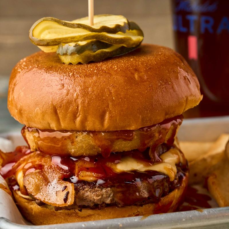 Half-pound Angus beef topped with bourbon sauce. Served with bacon, pepper jack cheese, fried onions, lettuce, tomato, and pickles.