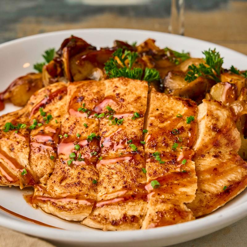 Chicken $19.00 | Shrimp $20.00 • Blackened protein cooked with onions and mushrooms in our bourbon sauce, served with roasted potatoes.